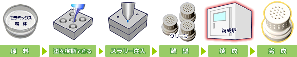 | スラリー注入 | セラミックス粉粒体に水などを混ぜて泥しょう(スラリー)状になったものを型に注入します。 |